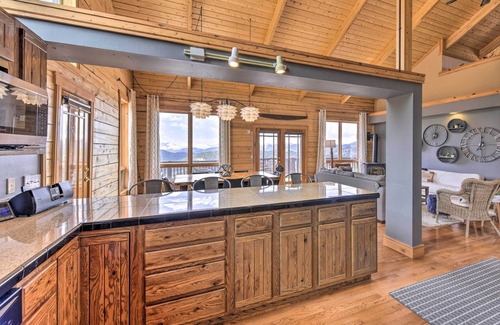cabin features: smart tv, wood-burning stove & gas fireplaces, large dining table, breakfast bar, mountain views