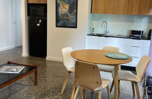 Self contained unit with own entry ( 4 adults maximum) with large light lounge and kitchenette (cooking facilities but no stovetop) with fridge/freezer.