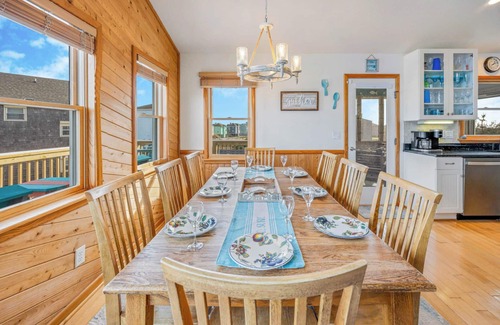 SEMI-OCEANFRONT Rodanthe - Ocean Dr. - Bedecked in both modern coastal charm and wrap-around verandas that reveal spectacular panoramic views, DECKED OUT lives up to its name in every possible way. Sitting just a block off the ocean, this four-bedroom/three-full and one-half-bath home offers a private family escape that will delight both adults and kids alike. A ground-level 14’x28’ private pool is the perfect place to splash away a day or relax in a chaise on the sunny deck. Not a pool day? Just inside, a den featuring a queen sofa bed, 4-in-1 gaming table, refrigerator, and TV equipped with an Amazon Firestick offers an alternative respite. Three of the home’s comfortable bedrooms occupy the first floor: A king master with an ensuite bath along with a room with two double beds and another with a queen bed and bunk that share a full hallway bath. A wrap-around covered deck reveals a six-person hot tub, the perfect place for galaxy gazing or a soothing soak as you watch the sun rise. The home’s fourth bedroom, a primary king, is on the second level. This room features a jacuzzi tub and access to a private deck. Another deck and a screened-in porch are accessible from the great room, a lovely open area that brings everyone together for feasts, fun and games and those fabulous memories that family vacations create. Check your calendar and clear the deck for DECKED OUT. We’ll be ready to welcome you. (Fireplace seen in pictures is not available for guest use.)