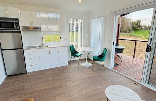 Red Hill Cabin #1 is sited on Red Hill Property and sits beside the original property residence dating back to the early 1900s. The new bespoke built cabin boasts a separate Queen bedroom and double basin vanity with walk-in shower, a spacious timber decked verandah and a modern kitchen and open plan living area. Designed specifically for this location, the abundant windows and sliding doors let natural light flood the cabin, whilst providing the guests with near unobstructed vista views. This cabin has country charm and character whilst providing modern comforts. Enjoy your private escape set within a treelined sheltered paddock, with a Northern aspect, overlooking cattle grazing in paddocks on a working Wagyu-cross cattle farm..