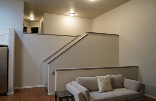 the upper level consists of 2 bedrooms with new beds, comfortable mattresses, and cozy linens One king bed is in the master room with brand new furniture, an en-suite bathroom for added convenience and privacy, spotless bathrooms with lots of towels, wash clothes as well as shampoo/conditioner/body wash, a hair dryer, first aid kit, countertop canister jars with lids filled with floss picks, cotton balls, and cotton swabs are provided.