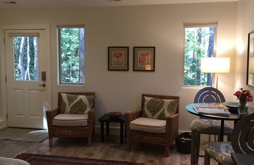 Zen-like modern cottage offering privacy, quietude and accessibility to the best trail system in the Asheville area.