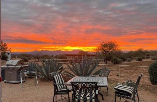 Recognized by Million Mile Magazine as one of the top 10 "Most Unbelievable Places to Celebrate Airbnb's 10th Anniversary" and awarded LUX Magazine's 2020 "Most Serene Desert Accommodation & Horse Boarding Facility- Southwest USA!" Additionally, VRBO selected Rio Rancho Verde (one of 5 vacation rentals out of 3500 in Scottsdale) for a YouTube promotional video, and we've been featured on both a Hulu series special and a Western film production. Rio Rancho Verde offers an amazingly unique Arizona experience, far from the maddening crowds! This exclusive horse ranch/boarding facility is nestled in the heart of the Sonoran Desert, only 20 - 25 minutes from Scottsdale. Our property sits on the border of the Tonto National Forest, and is the perfect authentic Western adventure. Enjoy an upscale ranch experience and discover the inner operations of an exclusive horse boarding facility, just a short distance from Scottsdale. You can experience the "behind the scenes" day to day operations of ranch management and barn maintenance, help us feed the horses carrots from the garden, take a roping lesson from our on-site expert (no cows involved!), sign up for manure management or rent a trusty steed at the stables down the road. Our spacious, luxury travel trailer offers designer décor with a combination of upscale Southwestern and Western furnishings and accessories, with all the amenities. Over 500 square feet of open floor plan, complete with fireplace, separate bedroom and bathroom, huge shower, full kitchen with island, big screen TV, Barcaloungers, queen size bed, huge closet space, additional pull out sofa bed, AC and heat, dining area (seats 6) and your own private spot that faces the Four Peaks Wilderness area. Enjoy cocktails as you watch the sun set and turn the skies crimson, take your morning coffee down to the barn while the horses wait for their breakfast or enjoy the sky full of stars over dinner on your own private patio. We're the perfect destination for hiking, biking and exploring right out of our back gate - we're situated 1/2 mile from the Scottsdale McDowell Sonoran Preserve, which offers 32,000 acres and over 215 miles of trail to explore. Or, just relax and refresh while enjoying a glass of wine as you watch the spectacular sunsets on the ridge overlooking the mountain peaks and desert vistas. We're secluded and surrounded by the most amazing mountain views, saguaro cactus and Sonoran Desert scenery and offer a relaxing alternative to the fast pace of city life. The night skies are filled with stars and you're sure to hear a coyote or two howling in the distance. Take a side trip to the Verde River (9 miles) and keep an eye out for the wild horses that call this area home. There's a stable down the road where you can rent horses, and we can have mountain bikes delivered to the ranch for you. We're committed to an Eco-Ranch lifestyle and are committed to sustainability, being mindful of the ecology in which we live and embracing the environment that surrounds us. We have an organic garden on site and you're welcome to help yourselves to the vegetables we grow. Reduce, reuse, recycle and re-purpose! It's an amazing beautiful site, far enough out that you'll feel like you're in the middle of nowhere but only 25 minutes from Scottsdale and fine dining, galleries, shops and nightlife. Please note that we board horses and the owners are on site with them. We also have 2 other short term rentals, so there are other guests on property. Come join us at Rio Rancho Verde! If the travel trailer package is not available please see our other listings at VRBO 652267 or VRBO 763667. we hope to see you at rio rancho verde!