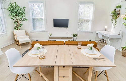 even though this rare space is 1bd/1ba it feels spacious We outfitted the apt with everything you need to enjoy your stay. The apt has full-sized appliances, an office space, room darkening curtains, and a luxe bathroom. It truly is a haven for long stays and people who want a bright and airy home away from home.