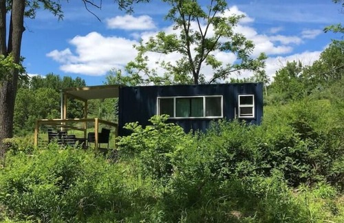 baby blue at sugar creek is a 8 foot x 20 foot shipping container home on 10 serene park-like acres with towering sycamore and black walnut trees, lots of wildlife and a creek flowing through the property Very private and very close to all of the assets of the Finger Lakes. Wineries, breweries, hiking, bicycling and Keuka Lake just minutes away. on instagram at babyblue_sugarcreek