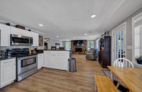 Sunset views / Point lot / Deep water / Mid-lake / Peaceful cove / Close to marinas & big water / Private beach / Private dock & boat ramp / Fire pit / Multi-generational & pet friendly / High speed internet / Spacious screen porch with TV & dining for 8 / Lots of parking / Loft / On site laundry / Great kids' bedroom / Indoor & outdoor games / fully remodeled with lake vibe. High end features like stone fireplace, Bidet toilet seat, Custom bathrooms, 5 smart TVs. Indoor and outdoor games.