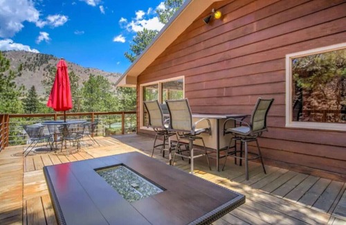 escape to this mountain retreat without sacrificing accessibility – it's conveniently located just off the main road from colorado springs, with a driveway that remains manageable even in winter As you park in the private driveway and ascend the stairs to the upper-level deck, you'll be greeted by expansive outdoor living space. Take in breathtaking views of the surrounding mountains and the clear Colorado sky, while enjoying ample seating and a captivating fire-table.