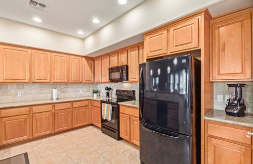 Don't miss this amazing townhouse in the highly desirable Serenity Shores, presented by Elite Vacation Rentals. This 30 night minimum gated community offers lush landscaping, waterways, walking trails, a HEATED pool and spa and a gym. The townhouse itself is tastefully appointed and is 2nd floor living with no one above you. Step inside and you will be met with a staircase taking you up to one story living area. An open concept kitchen dining and living room await. Anchored by a large smartv and fireplace. Comfy sectional seating for everyone is available to catch a movie or a sporting event. The large breakfast bar provides extra seating for the kitchen and living area. The kitchen is spacious with everything you will need to make a meal in or prepare for a BBQ in the patio/balcony. The dining room seats 6 and is adjacent to the kitchen.