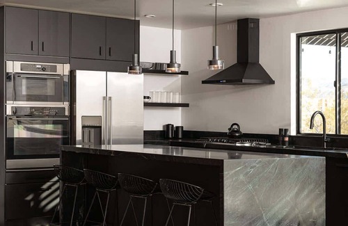 the modern kitchen is fully equipped for preparing meals with stunning views