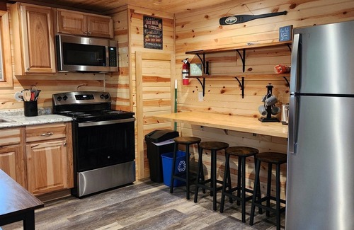this beautifully updated cabin features a newly renovated, fully equipped kitchen and a modern bathroom with a full walk-in shower With space to comfortably sleep up to 9 guests, it’s perfect for families or groups. Bedroom One boasts two queen beds, while Bedroom Two offers a queen bed and twin bunk beds. The cozy living room includes a queen sofa sleeper, brand-new furniture, a Smart TV, and fresh carpeting installed in 2024. The cabin also shines with updates like new queen beds and a durable new metal roof.