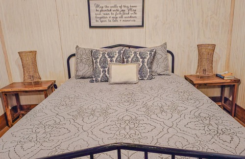 three room cabin with a full bed, sofa sleeper, twin loft, and full bath Private deck and coffee bar. Sleeps up to 5.