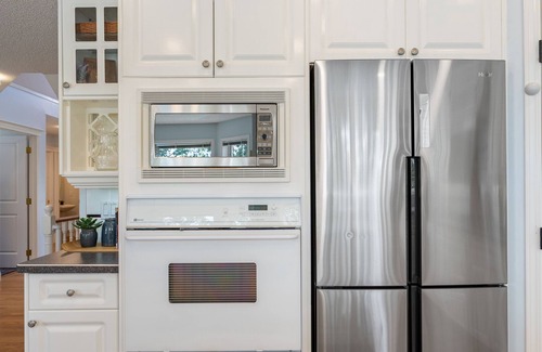 the modern kitchen features full cabinets, a gas range and stainless steel appliances There is a living room adjacent to the kitchen with plenty of seating for large groups to gather around the cozy fireplace. This room also has a 50" Smart TV w/cable and views of the golf course.