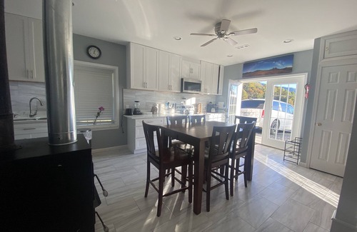 the space features four large bedrooms, with three king beds, two queen beds, and two additional queen air mattress, crib and couch to accommodate 14 guests Four bathrooms, bathtub, jacuzzi, glass enclosed shower, free standing cast iron tub, a glass enclosed shower, and a standing shower. Kitchen is fully equipped with a full sized refrigerator, oven, stovetop, microwave, dishwasher, coffee maker, knives, silverware, utensils, plates, cup, bowl and glasses. Washer, Dryer, and Detergent available to guests for use. The space also features a comfortable, height adjustable desk, living room, dining room, sofa, and large TV’s in the living room, master bedroom, and upstairs' bedroom. Includes the entire first floor and second floor. The basement is fully equipped with a full second kitchen, utensils, dinnerware, full gourmet kitchen, coffee maker, refrigerator, stove, oven, dishwasher, microwave, recliner sofa, and large TV’s. with over 4,300 square footage on the first floor, second floor, and third floor, porch, deck, picnic area, it provides ample personal space for everyone!