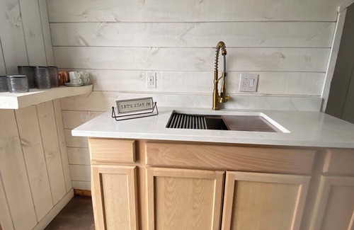 there’s an official bedroom upstairs & a quaint kitchenette In the living area there’s also a couch made to sleep 2 small children or 1 adult w/ a 55” TV. Downstairs is a high end king size sleep sofa. There’s plenty of room downstairs to open up the ping pong table and enjoy the 65” TV..