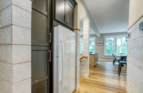 all lakemore resort homes feature an open-concept kitchen, dining, 4 seasons screened porch, and main-level living room Views from Arbutus Lake are featured in all the main living areas, and new leather furniture will provide the perfect seat to take it all in.