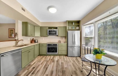 there is a full kitchen with all the kitchenware, including a full-size stove/oven and refrigerator, microwave, dishwasher, toaster, coffee maker, pots and pans, mixing bowls, baking dishes, blender, and an assortment of kitchen utensils Tableware includes plates, bowls, glassware, and eating utensils. A bistro set for two is located by the bay window in the kitchen area, while a dining table for six is adjacent to the kitchen.