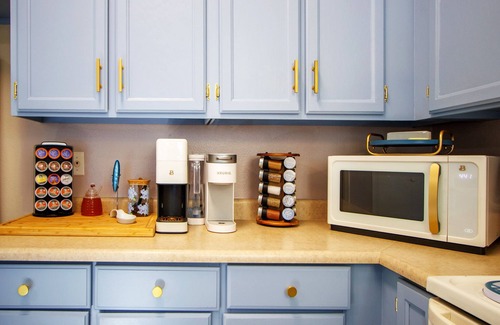 the kitchen has both a keurig and a drip machine, and as many kitchen appliances as i could think of There is an electric griddle, an electric kettle, an InstaPot, a slow cooker, a toaster oven, a microwave, and a blender device. Cabinets are fully stocked with dishes and cutlery, tin foil, sandwich bags in all sizes, etc. There is a water tower/ice maker for hot and cold water. There is also workout equipment - a treadmill, a bike, and an elliptical type machine.