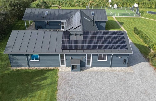 Single-family house, built in 2019. 350 m from the sea. Private: natural state property 2'136 m2, indoor pool. Hot tub, barbecue, children's playground (slide, swing). In the house: sauna, table football, trampoline, washing machine, tumble dryer. Parking at the house. E-charging station. Grocery 1 km. Golf course 7 km. The owner does not accept any youth groups.
