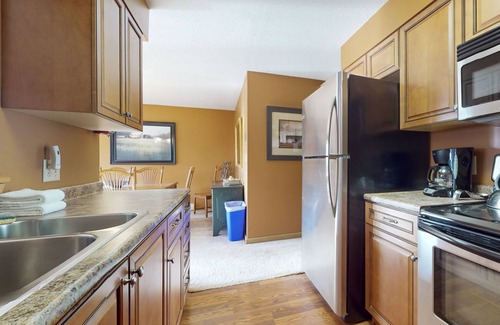 this inviting, ski-in/ski-out condo is perfect for families and groups of friends You will find plenty of space and privacy in a gorgeous wooded setting. Find a well-equipped kitchen with all the essentials to whip up everything from full-course meals to quick snacks on the go. The living room is cozy and offers a great spot to unwind with your loved ones after a fun-filled day. Snuggle up in front of the wood-burning fireplace and watch a favorite show or movie on the TV, or take a refreshing midday nap on the comfy sofa. The balcony with a two-person bistro table offers nice views down the slopes and pond.