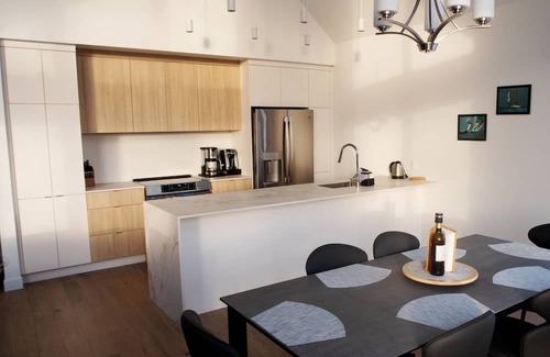 A Ski-In/ Ski-Out condo on a family friendly mountain in the Eastern Townships of Quebec with views of Lake Memphremagog and the Owl’s Head mountain. Long-term rental (32 days+) with flexible dates. Brand new penthouse unit in Glaz 5 development. Two bedrooms with King beds and a mezzanine with an office space and a comfortable Queen queen-sized retractable box bed (NOT a hide a bed with mattress). Two full baths with heated floors. Very bright and lighted with 3 exterior walls. Fully equipped kitchen and brand new appliances and furniture. Propane fireplace and high-resolution flat-screen TV. Open space design with dining, kitchen and living all with high cathedral ceilings.