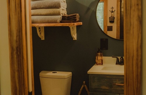 the captain's quarters contain the kitchen, full bathroom (with shower) and second queen bed The entire site has pulled architectural inspirationfrom old wooden hand-hewn ships. Both the wood creations we've crafted and landscape really need to be seen in person to capture the magic of this place designed to help your imagination run wild! The lower hull of the Captain's Quarters is mounted to a massive boulder and includes a lounge net, front deck, and roof deck. Each unit includes heat, air conditioning, electricity, and full indoor plumbing. sail away!