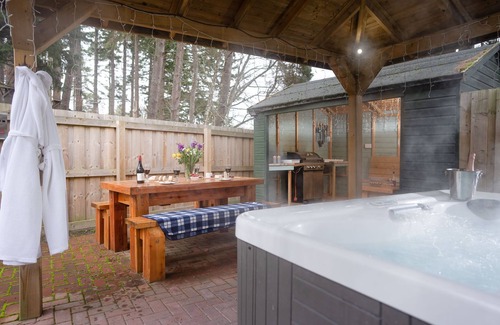 with five luxurious en-suite bedrooms in the main house and a further en-suite bedroom in our tranquil riverside suite, spacious living room, riverside tv lounge, dining room , kitchen, utility and boot room, there's plenty of room for an indulgent group getaway Extra special spaces you can enjoy together include an outdoor cooking area and hot tub.