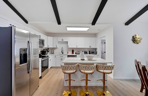 Sleeps 17 people!! Your own Stunning luxury home with its own backyard beach! Resort Style Heated Pool! Poker table, Pickleball, Pool table, Mini Golf, Chess, Dominoes games, Aw did we mention Cornehole and surfboard Bar! Enjoy the Outdoor Gazebo with a Waterfall! OMG! Enjoy West Tampa, the immaculate kitchen, 4 spacious bedrooms, 1 game room, 2 full baths and an outdoor shower, solar heated! Minutes away from downtown, Zoo Tampa, USF, Bush Gardens, Adventure Island, Hyde Park, Raymond James Stadium, Airport, International Mall, Shopping centers, Malls, you will love the conveniency of this location, and all the games, see you soon!.
