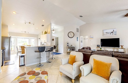 inside, the open living and dining areas provide plenty of room to gather A fully equipped kitchen makes meals at home a breeze, while three comfortable bedrooms ensure everyone has their own space. With central AC, a washer/dryer, and modern furnishings, the home blends convenience and comfort—ideal for both long stays and weekend getaways.