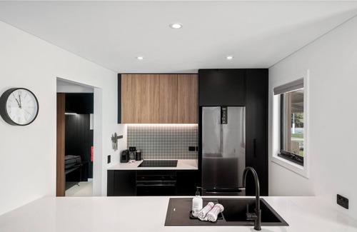 the open-plan living area is designed for relaxed entertaining, with a new feature fireplace, smart tv, and a solid oak dining table for six Slide open the glass doors to your private balcony and take in the uninterrupted views of the lake and mountains—keep an eye out for the occasional platypus visit.