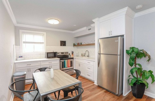 this newly renovated 2-bedroom, 2-bathroom beach cottage features modern upgrades throughout The living space boasts hardwood style floors and ample natural, and bulb lighting. The kitchen is equipped with stainless steel appliances, granite countertops, and a stylish backsplash. Both bedrooms are spacious with ample closet space, and the bathrooms are elegantly updated with contemporary fixtures and finishes.