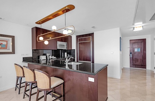 this modern apartment features a full kitchen with stove, oven, microwave, dishwasher, large fridge and freezer, as well as a mini bar provided by the hotel (items in mini bar are additional cost) Enjoy a king-size bed in the master bedroom, a full size comfortable sofa bed in the living room, two full bathrooms, washer and dryer and a private balcony featuring breathtaking views that will strike you the second you enter! This apartment is sure to please every guest that waits to see the stunning coastline and turquoise waters of Miami Beach.