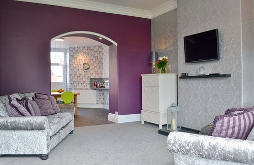 bathroom: bath, shower, toilet Gas central heating, electricity, bed linen, towels and Wi-Fi included. Cot and high chiar available.. Small enclosed garden (shared with UK2206). On road parking. No smoking. Bike stre.. One of two elegant apartments in an enviable location situated on the elegant South Bay of Scarborough just a short stroll from the town centre with all its attractions and amenities. South Cliff Sands II is a stunning first floor duplex apartment. It has a good sized living room and a spacious kitchen/dining room on the first floor, one bedroom on the second floor half-landing, and two further bedrooms three steps further up, one which has an en-suite shower room.