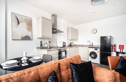 this convenient 1 bedroom apartment is part of a modern development and has been finished to a high standard with comfortable furnishings and modern appliances throughout The bright open plan living space has a modern fully equipped kitchen with everything you need to cook your own meals at home, a dining table, sofa, armchair and smart Tv. The comfortable bedroom features plenty of storage space for clothes and a double bed made up with crisp hotel linen. The modern family bathroom has a shower and bath, toilet and sink, as well as complimentary toiletries with fluffy towels for your use.