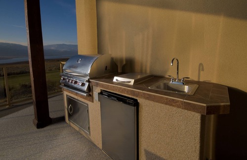 inside, you’ll find a bright and functional kitchen equipped with full-size appliances, plus skylights that let in the natural light The outdoor cooking area includes a built-in BBQ and mini fridge—ideal for grilling on warm Osoyoos evenings.