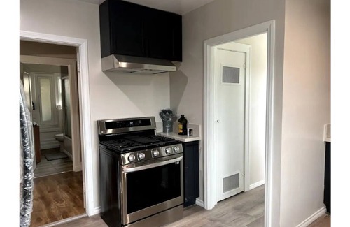 This private home features a very spacious and stocked kitchen equipped with all new stainless steel appliances, a stove, a coffee maker, pots, pans, and cooking utensils. The kitchen along with the dining area make for a perfect evening cooking or enjoying a meal with friends and family.