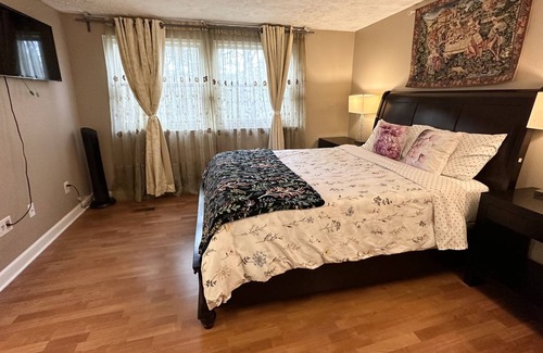 the neighborhood is centrally located near george mason university (gmu), vre burke center station There are two assigned parking spaces right in front of the home. There is a modern, fully stocked kitchen with stainless steel appliances and granite countertops. The master bedroom has a queen bed. There are 2 additional bedrooms that are smaller with Queen size bed as well. There is a washer and dryer in lower level for your convenience. Ideal for individuals, young families or business travelers. The space would be most comfortable for group up to 8..
