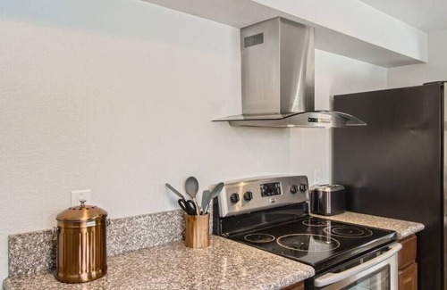 ● fully-stocked kitchen with spacious counter and cabinet space, stainless steel appliances, and everything you need to make a delicious meal