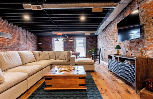 Quaint, historic, downtown New Albany is waiting for your group in this 5-bedroom building. This 2 story loft (second and third floors) was formerly a part of the New Albany Opera house. It has 1 king primary, 2 queens rooms, two twin beds, and 2 sets of bunk beds (for total of 9 separate beds amongst five bedrooms) and is perfect for your large group of guests. This location is within walking distance to MANY local restaurants and shops with plenty of parking at your door step. The historic Wine House loft sits above the Wine Shop, a boutique restaurant and shop that will also deliver upstairs. Your group will enjoy multiple living spaces plus a large hang out room with pool table and bar..