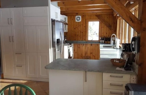 the house has a fully equipped large modern kitchen and a propane grill on the deck Other amenities include high speed internet, a wood-burning stove in the living area and a Solo fire pit on the deck, with plenty of wood for both provided without charge. We also provide canoes and kayaks without charge.