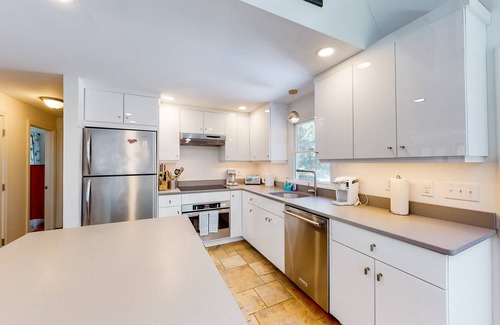 home chefs will love the modern kitchen, newly appointed with a full suite of stainless steel appliances The island delivers ample preparation space and seating for two.