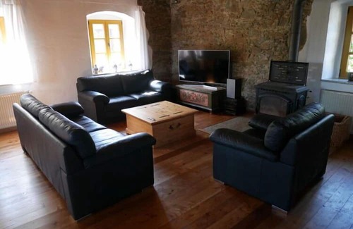 the jägerhof, a special luxury object of a special kind! quiet, idyllic,- village location on a southern slope in the beautiful fichtelgebirge Perfect for a vacation with a big family or friends. With us you will find pure relaxation and well -being, in the best ambience. Everything you need is in the immediate vicinity. Modern Fewo at the historic Jägerhof with top equipment. Your relaxation and health is important to us. Special highlight: rich wellness offer with relaxing massages, life coaching accompaniment healing fasting and much more can be booked in my practice directly on site. The spacious, light -flooded apartment of 150 sqm includes the entire upper floor. After the entrance area stairs, you will find a spacious, modern kitchen that is integrated into the very large living room. Furthermore, a tiled stove, a wood stove and a cuddly corner for cozy hours - time out for body and soul. 2 bedrooms of it an el