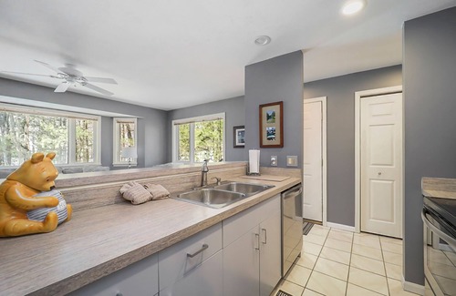 inside the home, gather in the spacious living area for a group movie night, or snuggle close to the fireplace on chilly nights while reading Head into the well-appointed, full kitchen to whip up delicious meals together. The second floor boasts a bookcase and cozy reading nook for quiet afternoons.
