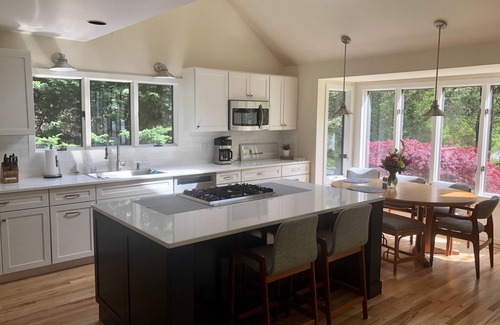 2724 square ft home, on .43 acre manicured property. Beautiful, sparkling, bright, open concept living spaces with all new hardwood floors and gorgeous large windows to take in the amazing view of Turtle Cove. Sunsets on the Western sky and one of the loveliest bay beaches in the Hamptons just minutes away. Light and bright throughout, kitchen with island and dining space open to comfortable family sized living area. Enjoy the Living Room/Dining room with huge picture window and water view, sliding door out to large deck and comfortable furniture overlooking large completely fenced yard. Two bedrooms on first floor, plus two full baths. Three bedrooms on second floor, two sharing a full bathroom, and the master with ensuite bathroom. Bedrooms are all large and have beautiful water views and offer King sized or Queen sized beds. We are in a quiet neighborhood, excellent for long walks and bike riding. A short ride to Long Beach, charming downtown Sag Harbor Village and its many excellent restaurants, shops and historical points of interest, as well as the Bay Street Theatre and Long Wharf. A full service farm stand, Serene Green Farm, is within walking distance of our house. Convenient grocery stores nearby as well. Best of all, we have our very own beach, and we offer the use of our three kayaks for your boating pleasure. We have a convenient outdoor shower to rinse off after a day at the beach. Five minutes to Long Beach, and fifteen minutes to the ocean beaches. Also nearby are the Channing Daughters and Wolffer Estate vineyards. The Sag Harbor public golf course is fifteen minutes away..