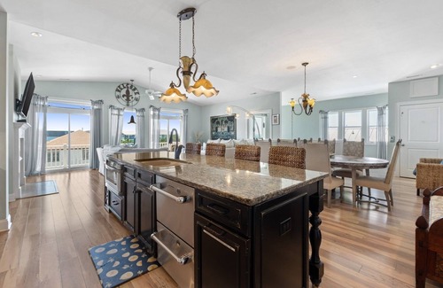 This gorgeous custom built home is 1block from the ocean, and is just 3 short blocks from the Downtown Kure Beach Pier, It has a reverse floor plan with spacious views of the Ocean. It has almost 4000 square feet of luxury living, with hardwood floors throughout. The Kitchen has custom cabinetry with a large island that houses the built in microwave, double ceramic sink, and 2 Drawer Dishwashers. There is a beautiful Italian Gas Stove and Oven with a custom mantle overhead. It has a spacious Open Floor Plan w/ Dining for 12 (8 at the table and 4 at the bar) The Living Room has Massive Views of the Ocean and Beach. Drink your Coffee on the Balcony or watch the Fireworks at Carolina Beach on Thursdays from the 3rd Floor Balcony. Enjoy the Moon View over the Ocean from this top floor. It's all tucked away on this safe and quaint little street. There is a Penthouse Suite on the Top Level, with a soaking Tub and Gigantic Tiled Shower. This suite features built ins, sitting area, 42" TV. There are also 2 very spacious Master Suites with Private Baths, and 40" Smart TV's - one has a Queen Bed, and the other has a King Bed. Across from the King Bed, there is a spacious room with a balcony and has a King Bed, and a 40" TV. Next to it, is a Queen Bedroom, with a balcony, and a 40" TV. These two share a spacious Bath with Shower/Tub, and lots of counter room. Every full size bath has a shower/tub. The Queen Master Suite is the size of the Penthouse, and has the most privacy of all the bedrooms. It overlooks the pool and faces the West, with a beautiful sunset from the windows. The Studio on the Ground level is rustic and spacious. It features 2 bunk beds, a Full and a Twin. It also features a mini kitchen/bar w/ coffee maker, mini fridge and a private bath w/ stand up shower and beautiful vanity. It has a 54" TV, a Sound System that plays in the Studio,, screened in porch, and throughout the backyard. The screened-in porch has plenty of lounging and is located in the backyard. There is a brand new pool with bench seating (not heated). There is a tremendous sized outdoor shower with hot/cold water - perfect for after a day at the beach, or any time of the day. We offer a full size Grill w/ propane, and all amenities that you would have at home. There is ample parking for 4 cars in the driveway.