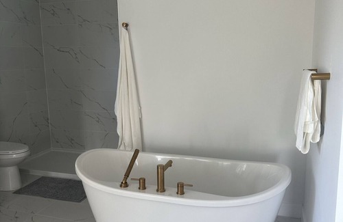 the first floor has a master bedroom with an attached luxurious bathroom with a free-standing tub and a shower