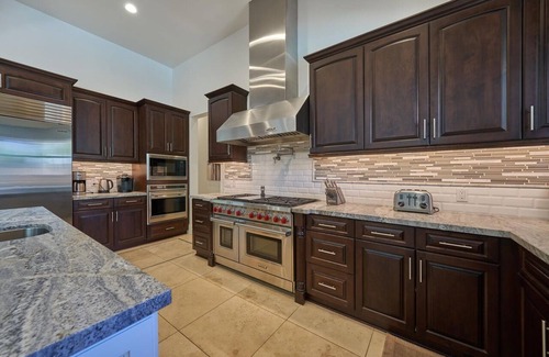 this grand home offers the perfect escape for a large family or group that wants modern conveniences and a grand resort environment The indoor spaces offer 12-foot ceilings, abundant light, exquisite stonework, an indoor fountain, gas fireplace, and an open welcoming living space with ample seating for lounging and dining.