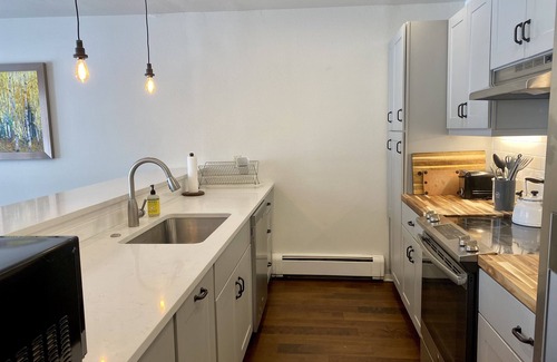 guests will find comfort in the natural rugs, linens, and bedding, ensuring a restful stay The main suite boasts a king bed and an ensuite full bath, while the second bedroom features a queen bed and the third bedroom offers a bunk bed with a full bed and a twin bunk. For added convenience, there's a washer and dryer, a fully stocked kitchen, and an incredibly comfortable Room and Board sleeper couch for extra guests on the main floor. Entertainment is covered with WiFi, games, toys, and TV featuring cable channels for game days and movie nights.