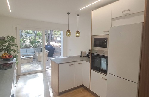 Nestled within lush Mediterranean greenery, the beautiful villa “Casa de Cala Gat”, which stretches over 2 floors, is situated in an ideal location and boasts incredible views of the Cala Gat cove and the turquoise sea as well as the gorgeous mountains. The spacious property consists of a living/dining room, a well-equipped kitchen with a dishwasher, 4 bedrooms (3 with 2 single beds each) as well as 2 bathrooms and can therefore accommodate 8 people. Additional amenities include Wi-Fi, fans, satellite television, a washing machine and a baby cot. Furthermore, the gorgeous house, which is located on a fenced property and offers guests a high degree of privacy, boasts a wonderful, private garden, 2 private terraces (open and covered), an outdoor shower, where you can refresh yourself on warm summer days as well as a barbecue to prepare delicious meals on. Approximately 5 minutes away driving in the heart of Es Pelats you will find a selection of shops, bars, restaurants and cafes. The nearest supermarket is also located here, just a mere 1.3 km away (a 5-minute drive). Right on your doorstep (just a 1-minute walk away or 34 m), the stunning cove, Cala Gat, which is surrounded by wonderful greenery and rocky cliffs, awaits your visit. Here you can soak up the Spanish sun and swim in the gorgeous, glistening water.