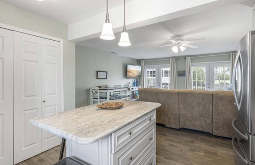 the open concept kitchen with granite countertops and stainless steel appliances is fully equipped for the chef Gather around the island or the dining table for food and games. Oversized sectional with reclining chairs also includes a full size sofa bed. Wireless internet in the condo allows for streaming on the flat screen smart TVs.