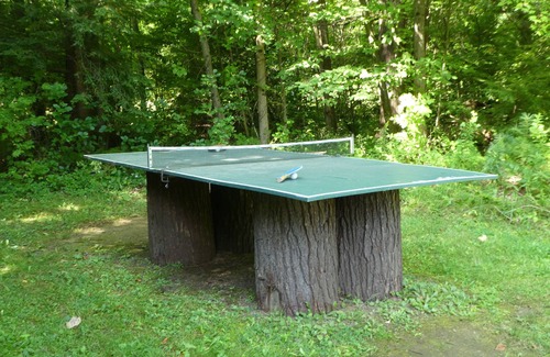 there is also a fire pit to make s'mores, and plenty of open area behind and in front of the house for activities There is a ping pong table in the back as well.